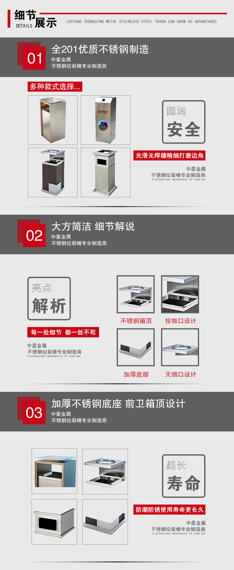 【品名】三分類垃圾桶 【品牌】 中星 【材質(zhì)】優(yōu)質(zhì)鍍鋅板 【內(nèi)膽】鍍鋅板、不銹鋼 【制作工藝】選用優(yōu)質(zhì)不銹鋼鋼板裁剪、壓制、折彎后再焊接而成型 【噴涂工藝】垃圾桶經(jīng)磷化噴砂處理后采用戶...