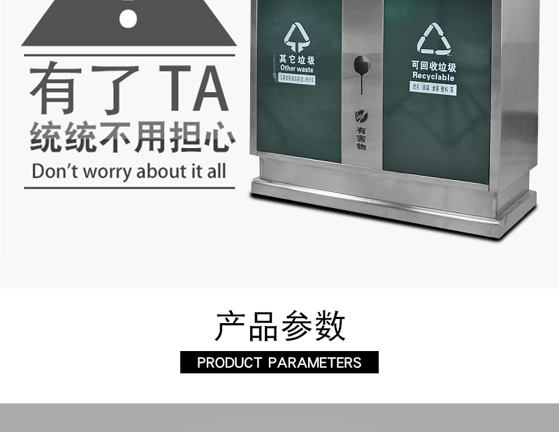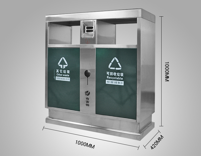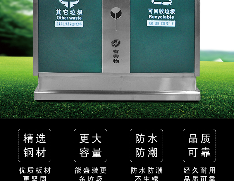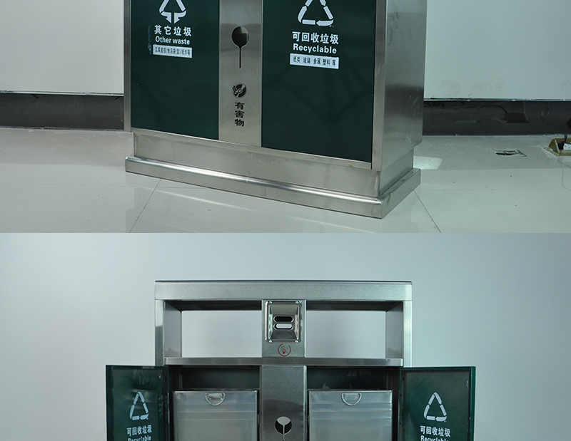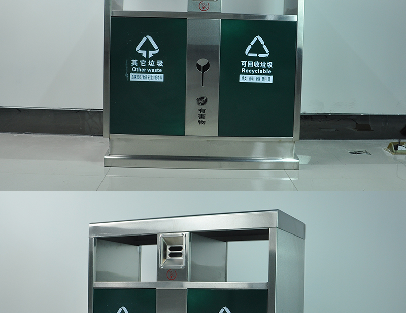 【品名】三分類垃圾桶 【品牌】 中星 【材質(zhì)】?jī)?yōu)質(zhì)鍍鋅板 【內(nèi)膽】鍍鋅板、不銹鋼 【制作工藝】選用優(yōu)質(zhì)不銹鋼鋼板裁剪、壓制、折彎后再焊接而成型 【噴涂工藝】垃圾桶經(jīng)磷化噴砂處理后采用戶...
