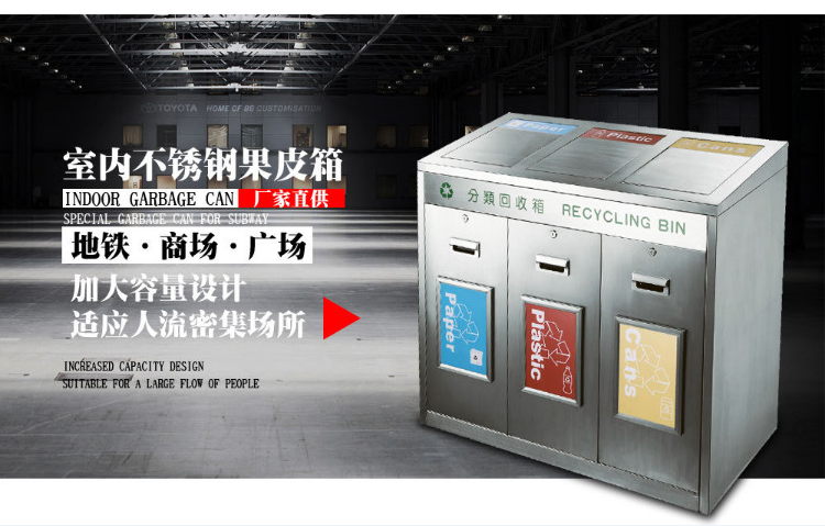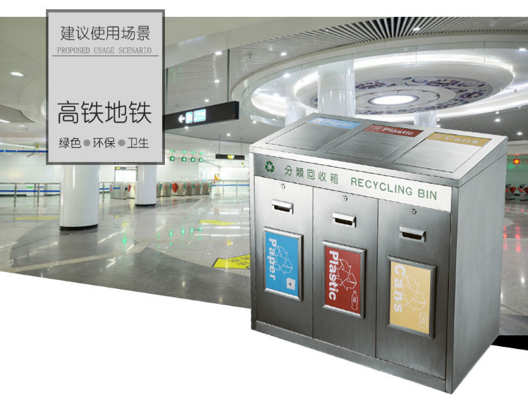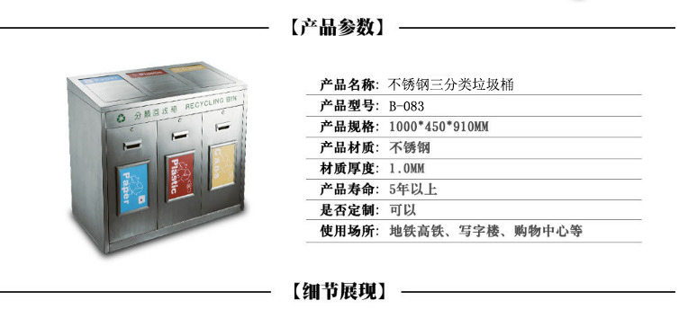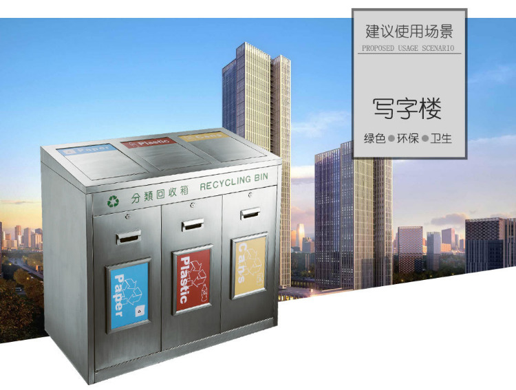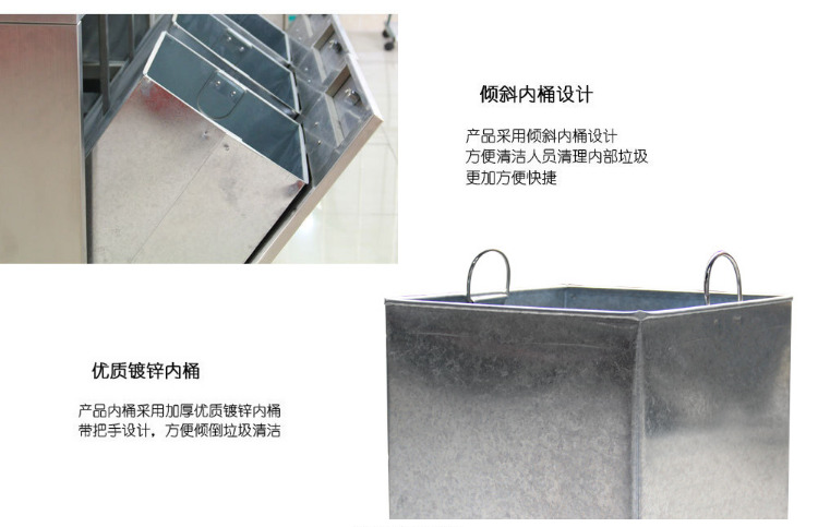 【品名】三分類垃圾桶  【品牌】 中星  【材質(zhì)】優(yōu)質(zhì)鍍鋅板  【內(nèi)膽】鍍鋅板、不銹鋼  【制作工藝】選用優(yōu)質(zhì)不銹鋼鋼板裁剪、壓制、折彎后再焊接而成型  【噴涂工藝】垃圾桶經(jīng)磷化噴砂處理后采用戶...