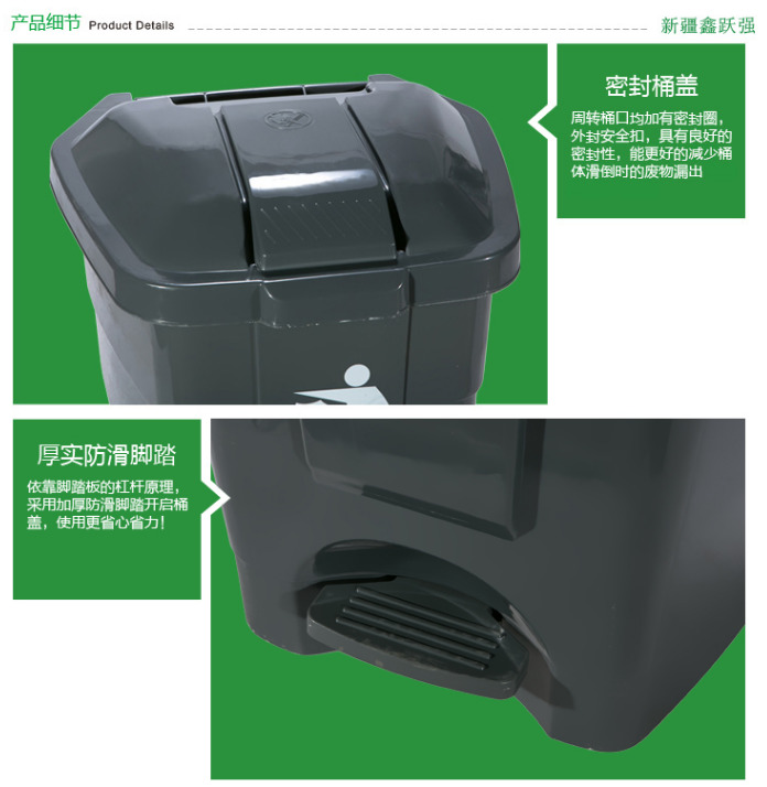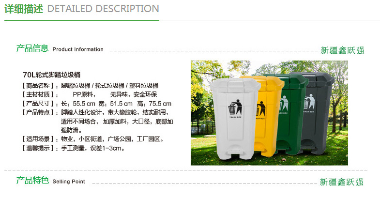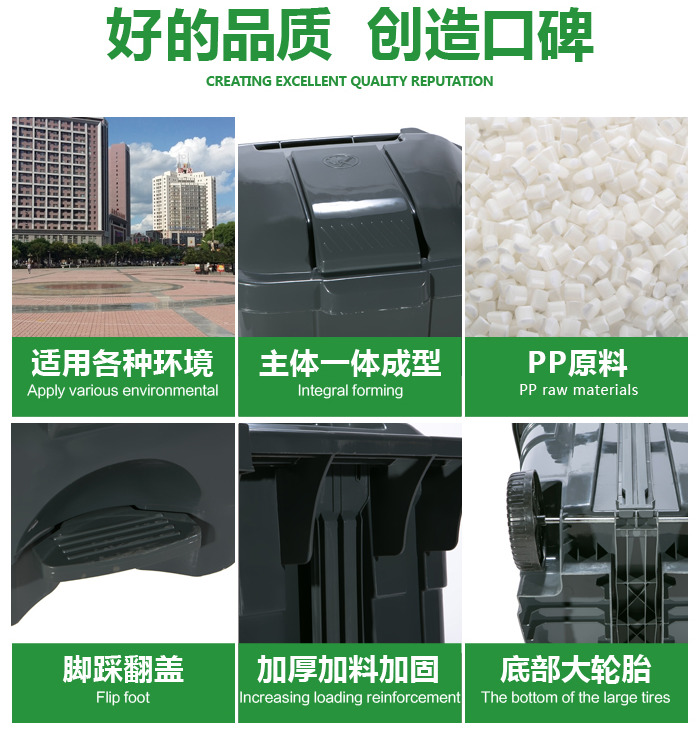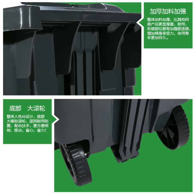 4、每只垃圾桶均裝有輪胎,您無需再行購置小垃圾車,更節(jié)省費(fèi)用。