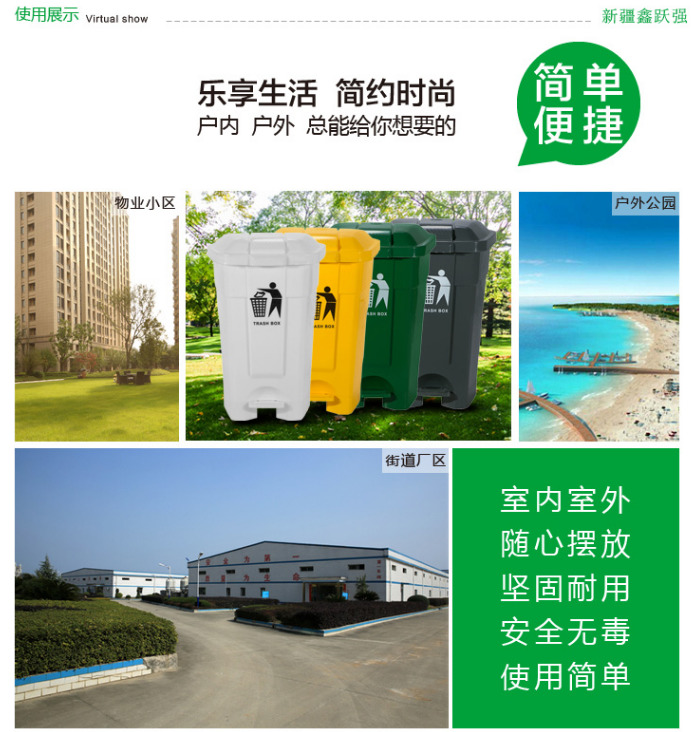 6、廣泛適用于各種環(huán)境,更可用與垃圾分類收集,如物業(yè)、環(huán)衛(wèi)、工廠等行業(yè),有多種顏色選擇。