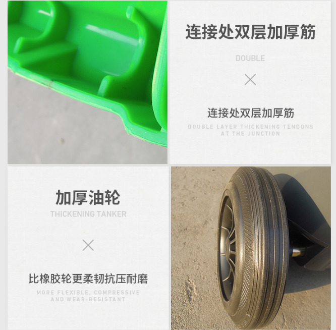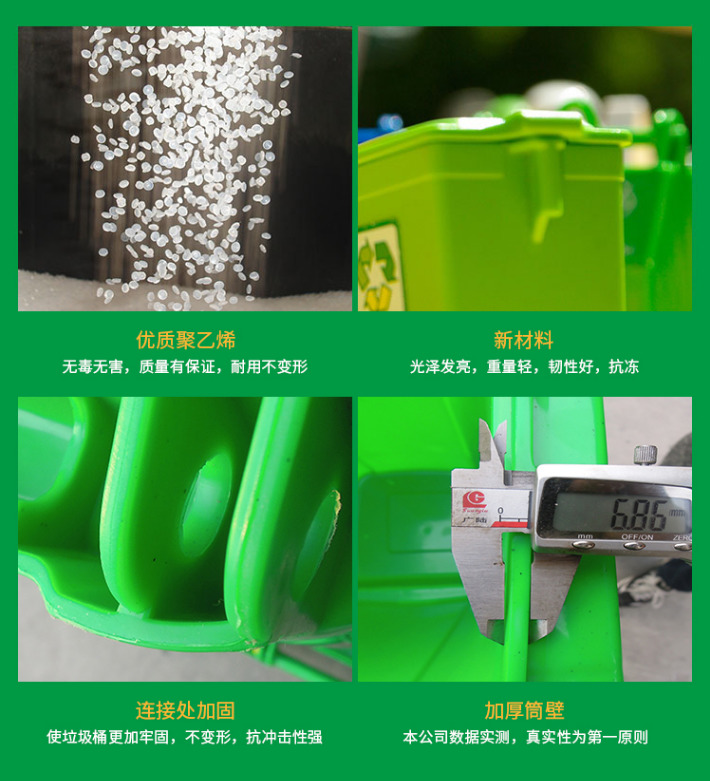 1、100%高密度聚乙烯原料注塑成型,耐酸、耐堿、耐腐蝕;HT-SL240M塑料垃圾桶,材質(zhì)全新料高密度聚乙烯,蓋子可阻隔桶內(nèi)的異味和防止雨水進(jìn)入桶內(nèi),輪子方便移動(dòng)。容積大,適用性廣。