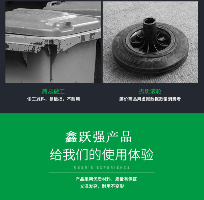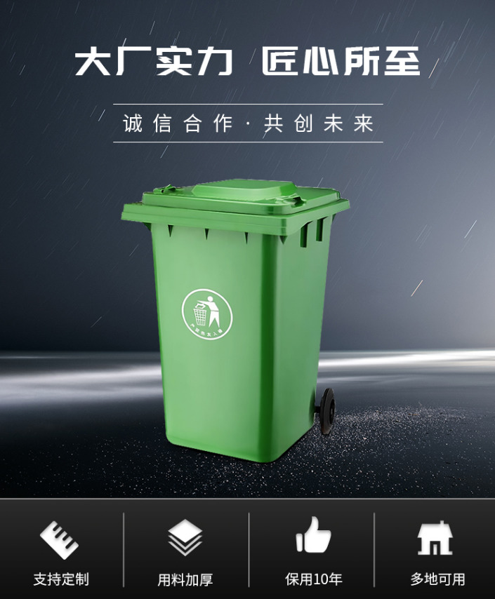 精選材料,源頭把控每一個(gè)品質(zhì)環(huán)節(jié),確保高品質(zhì)。產(chǎn)品名稱 660升塑料垃圾桶 產(chǎn)品型號(hào) ZX-660L 產(chǎn)品顏色 綠色/灰色/藍(lán)色/黃色/紅色 外桶材質(zhì) 聚乙 內(nèi)桶材質(zhì) 聚乙烯 容量 660L 建議使用場(chǎng)景 街...