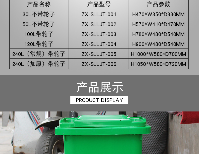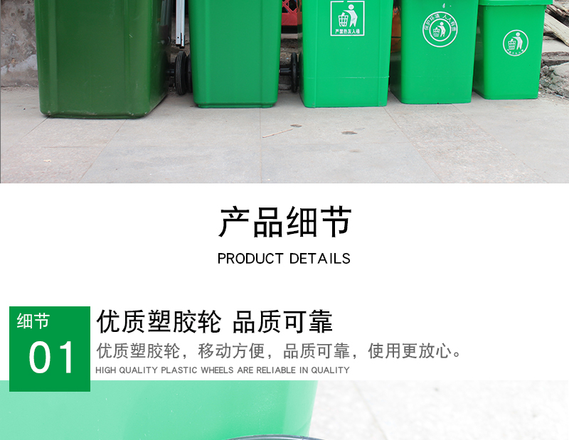 產(chǎn)品名稱 專用掛車塑料垃圾桶 產(chǎn)品型號 ZX-G240L 產(chǎn)品顏色 綠色 外桶材質(zhì) HDPE 規(guī)格(mm) 240L 產(chǎn)品重量 13-15KG 建議使用場景 公園、樓盤小...