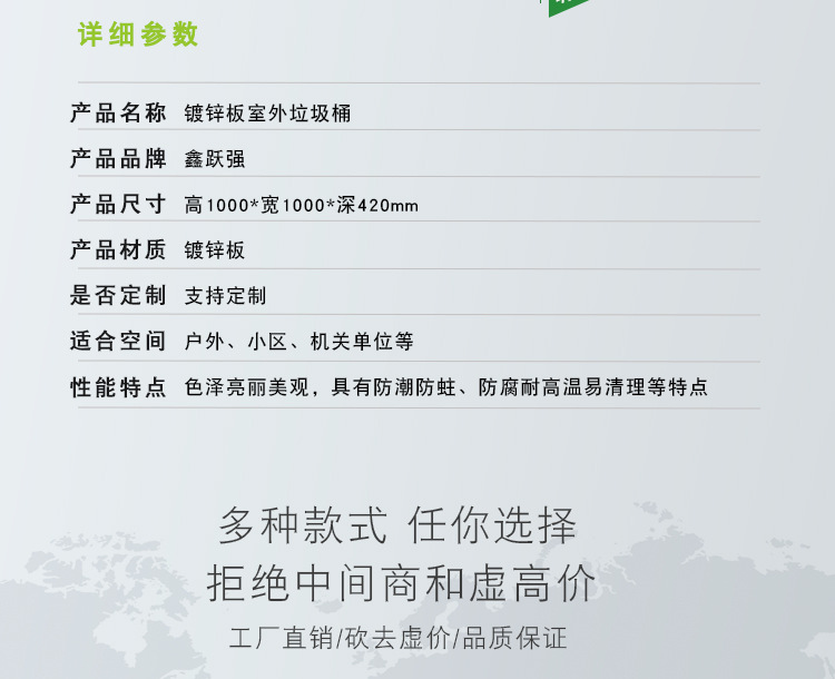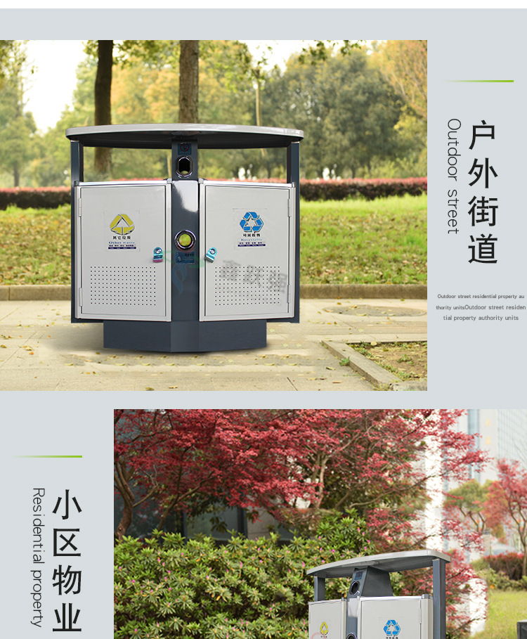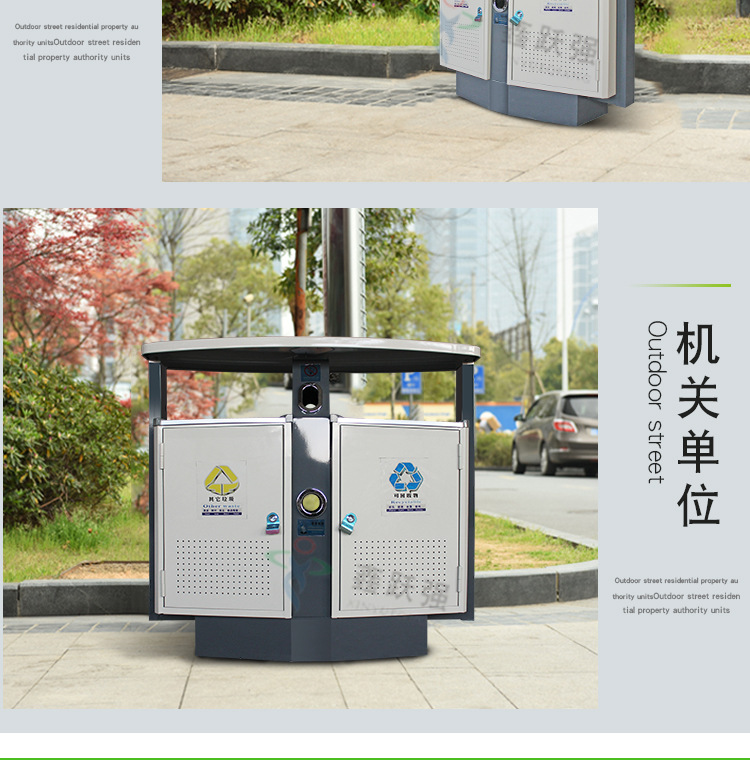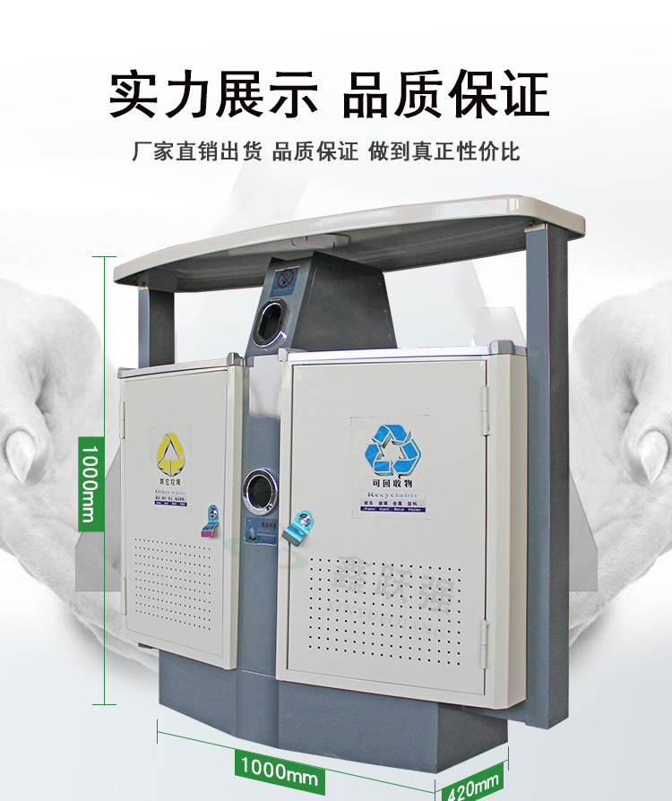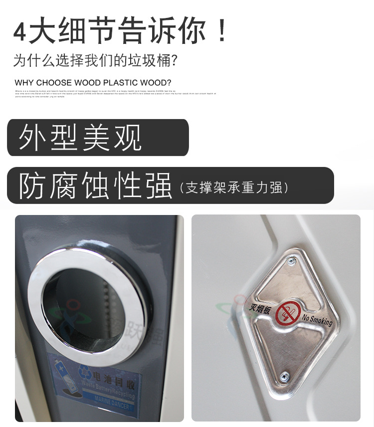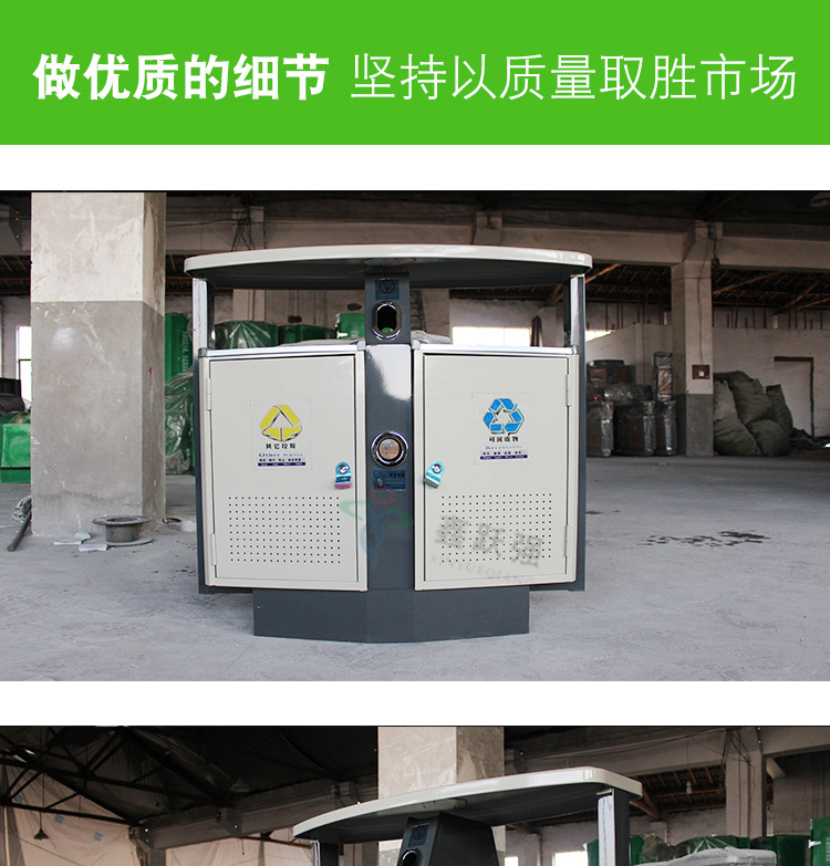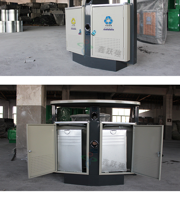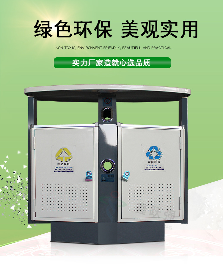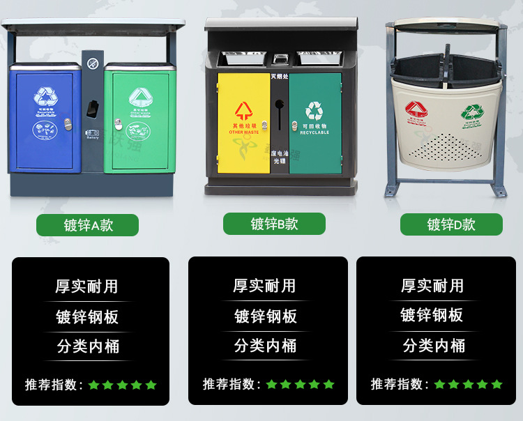 【品名】三分類(lèi)垃圾桶 【品牌】 中星 【材質(zhì)】?jī)?yōu)質(zhì)鍍鋅板 【內(nèi)膽】鍍鋅板、不銹鋼 【制作工藝】選用優(yōu)質(zhì)不銹鋼鋼板裁剪、壓制、折彎后再焊接而成型 【噴涂工藝】垃圾桶經(jīng)磷化噴砂處理后采用戶...