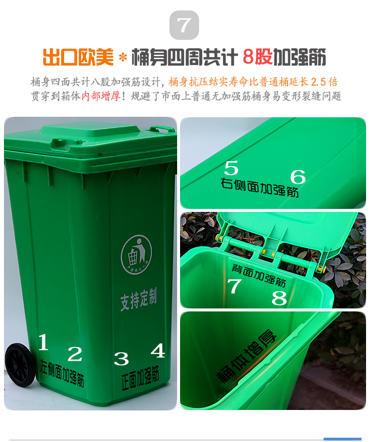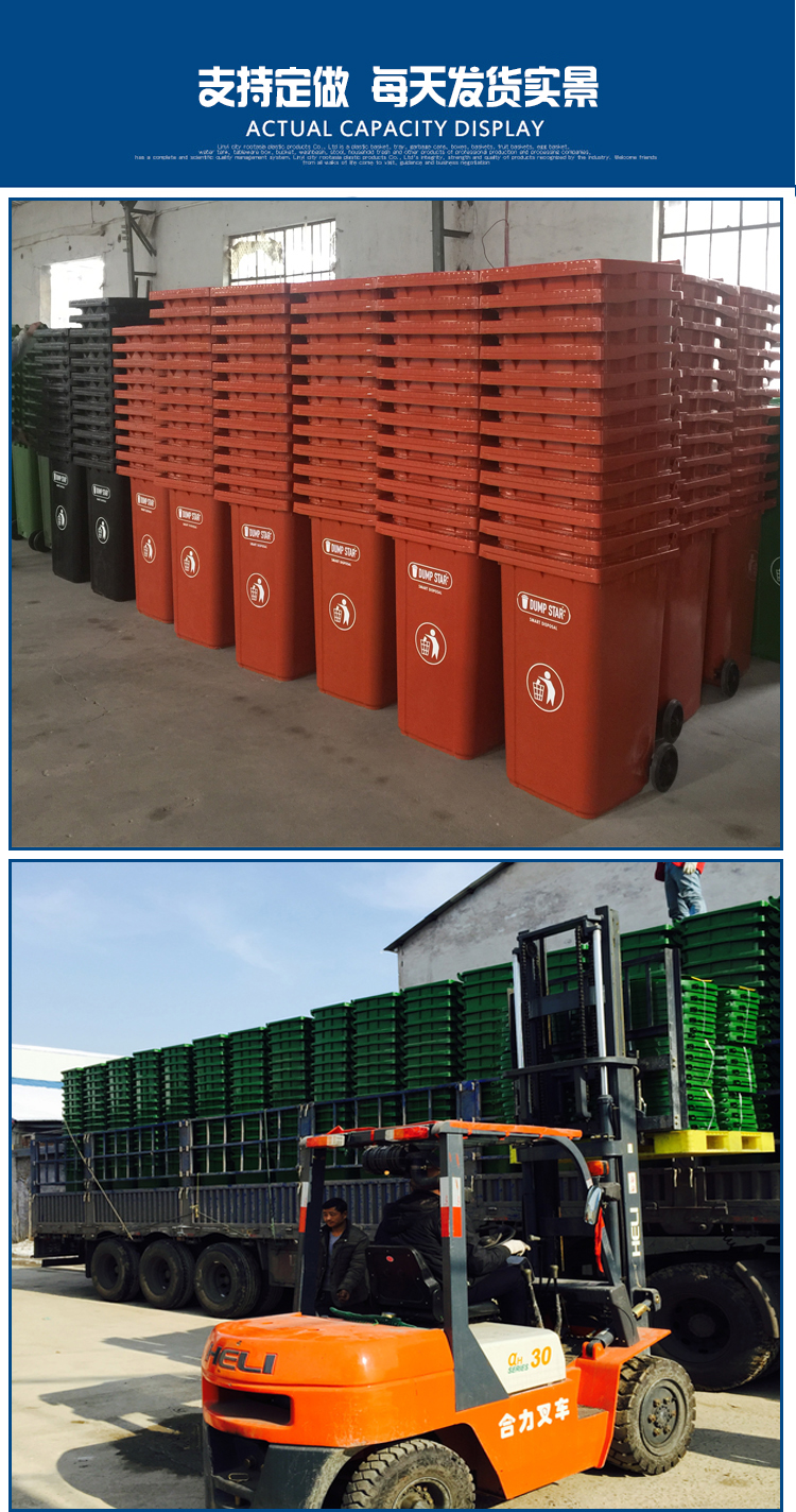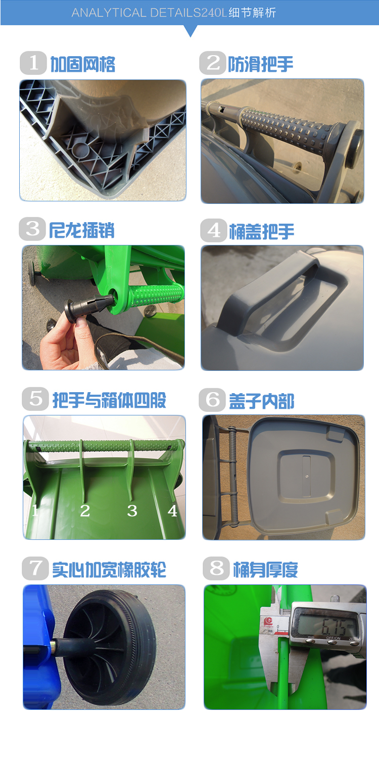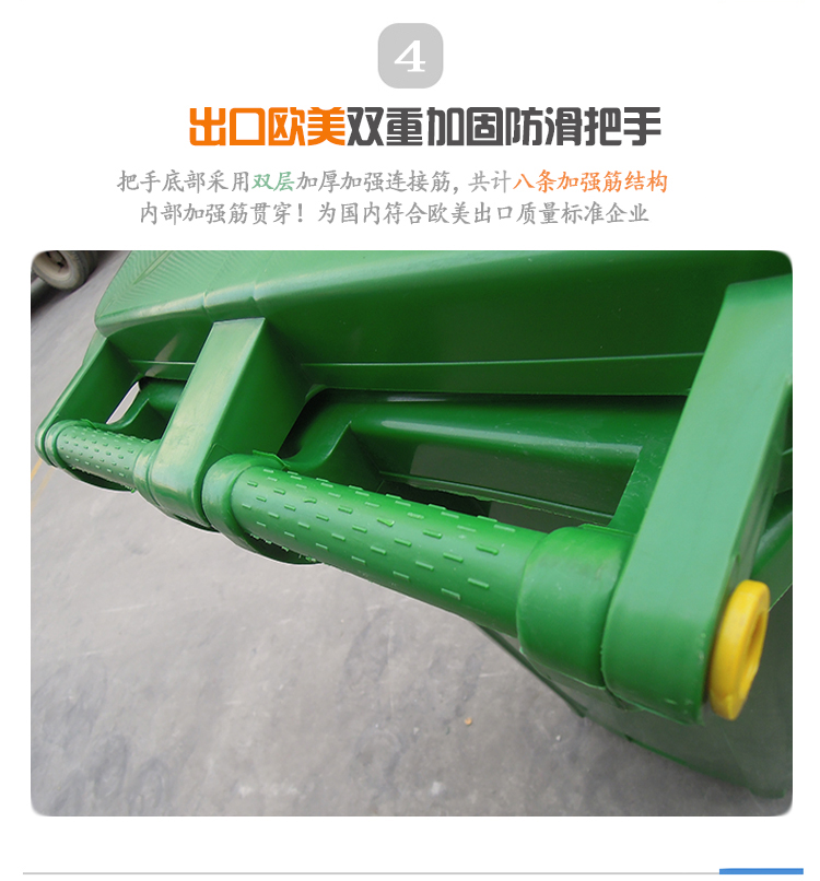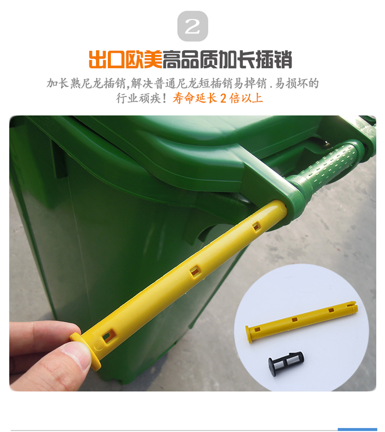 精選材料,源頭把控每一個品質(zhì)環(huán)節(jié),確保高品質(zhì)。產(chǎn)品名稱 660升塑料垃圾桶 產(chǎn)品型號 ZX-660L 產(chǎn)品顏色 綠色/灰色/藍色/黃色/紅色 外桶材質(zhì) 聚乙 內(nèi)桶材質(zhì) 聚乙烯 容量 660L 建議使用場景 街...