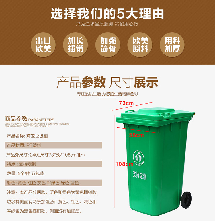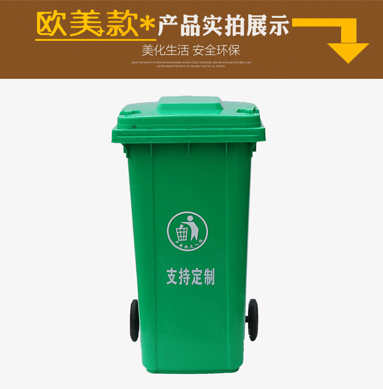 產(chǎn)品名稱 專用掛車塑料垃圾桶 產(chǎn)品型號 ZX-G240L 產(chǎn)品顏色 綠色 外桶材質(zhì) HDPE 規(guī)格(mm) 240L 產(chǎn)品重量 13-15KG 建議使用場景 公園、樓盤小...