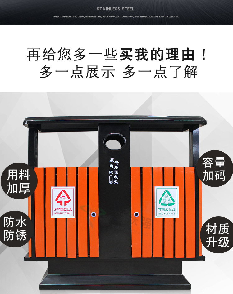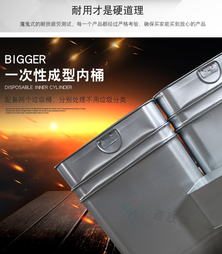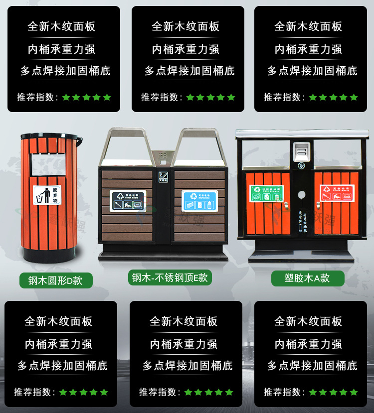 【品名】三分類垃圾桶  【品牌】 中星  【材質(zhì)】優(yōu)質(zhì)鍍鋅板  【內(nèi)膽】鍍鋅板、不銹鋼  【制作工藝】選用優(yōu)質(zhì)不銹鋼鋼板裁剪、壓制、折彎后再焊接而成型  【噴涂工藝】垃圾桶經(jīng)磷化噴砂處理后采用戶...