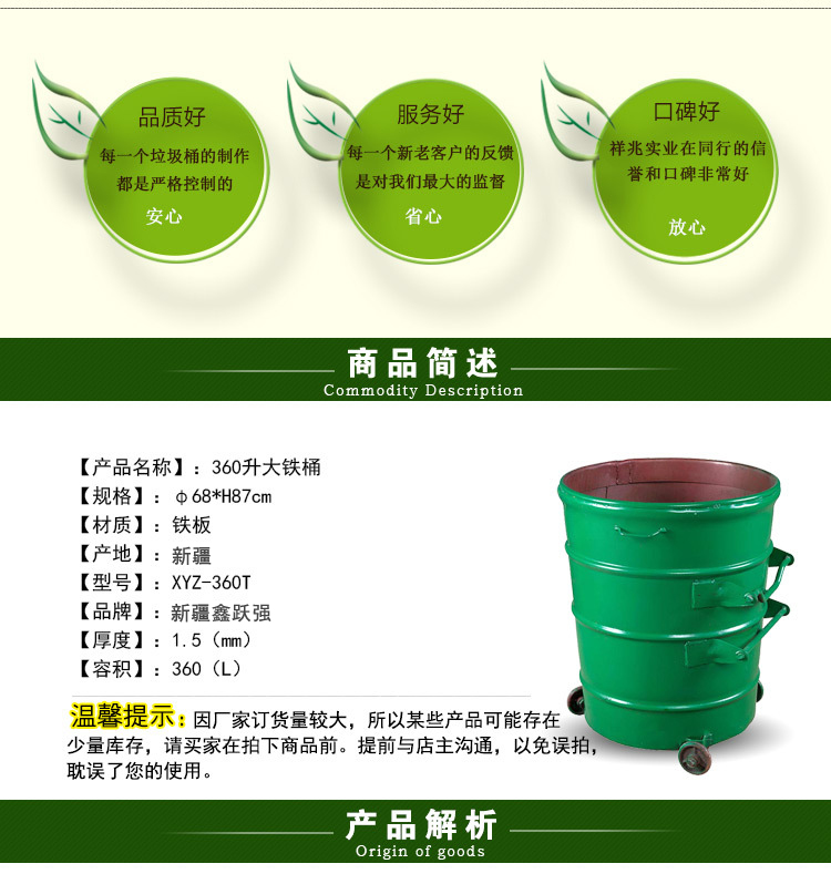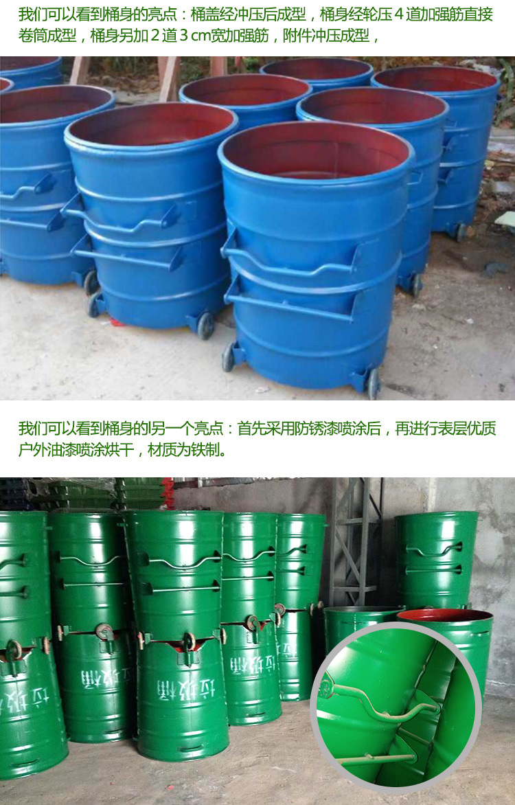 產(chǎn)品名稱 660升塑料垃圾桶 產(chǎn)品型號(hào) ZX-660L 產(chǎn)品顏色 綠色/灰色/藍(lán)色/黃色/紅色 外桶材質(zhì) 聚乙 內(nèi)桶材質(zhì) 聚乙烯 容量 660L 建議使用場(chǎng)景 街...