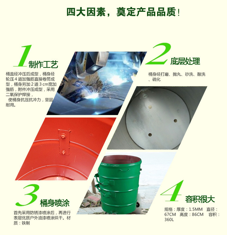 【品名】三分類(lèi)垃圾桶  【品牌】 中星  【材質(zhì)】?jī)?yōu)質(zhì)鍍鋅板  【內(nèi)膽】鍍鋅板、不銹鋼  【制作工藝】選用優(yōu)質(zhì)不銹鋼鋼板裁剪、壓制、折彎后再焊接而成型  【噴涂工藝】垃圾桶經(jīng)磷化噴砂處理后采用戶...