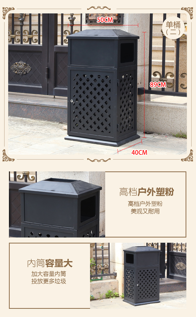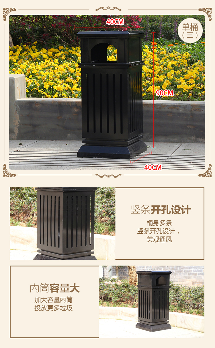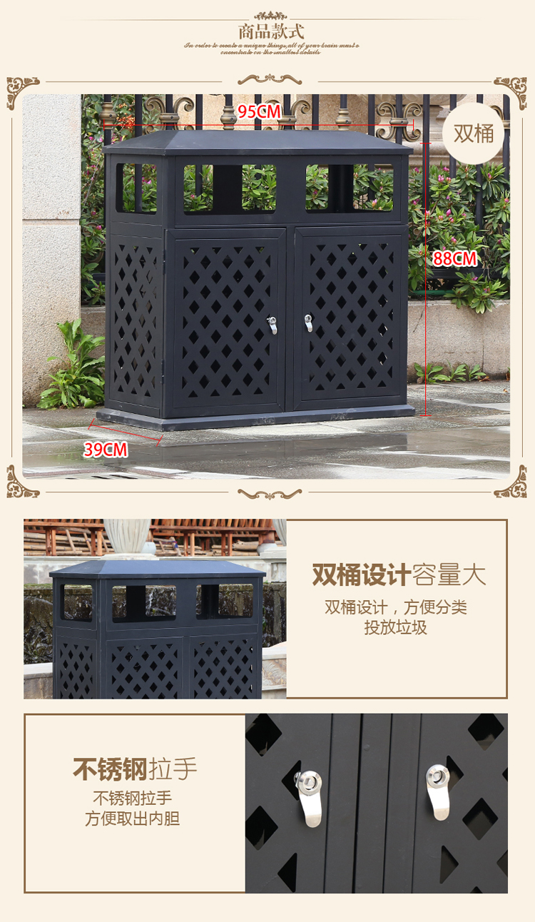 【品名】三分類垃圾桶  【品牌】 中星  【材質(zhì)】?jī)?yōu)質(zhì)鍍鋅板  【內(nèi)膽】鍍鋅板、不銹鋼  【制作工藝】選用優(yōu)質(zhì)不銹鋼鋼板裁剪、壓制、折彎后再焊接而成型  【噴涂工藝】垃圾桶經(jīng)磷化噴砂處理后采用戶...