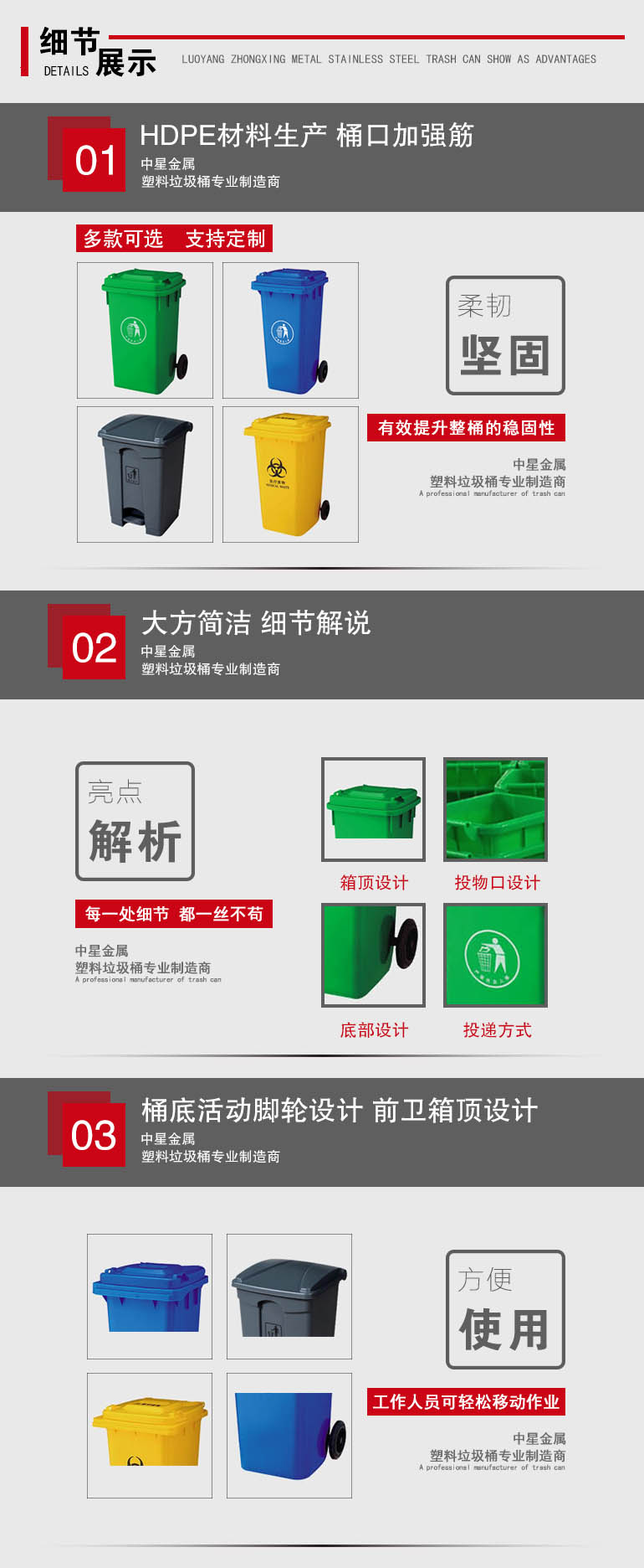 產(chǎn)品名稱 660升塑料垃圾桶 產(chǎn)品型號(hào) ZX-660L 產(chǎn)品顏色 綠色/灰色/藍(lán)色/黃色/紅色 外桶材質(zhì) 聚乙 內(nèi)桶材質(zhì) 聚乙烯 容量 660L 建議使用場景 街...