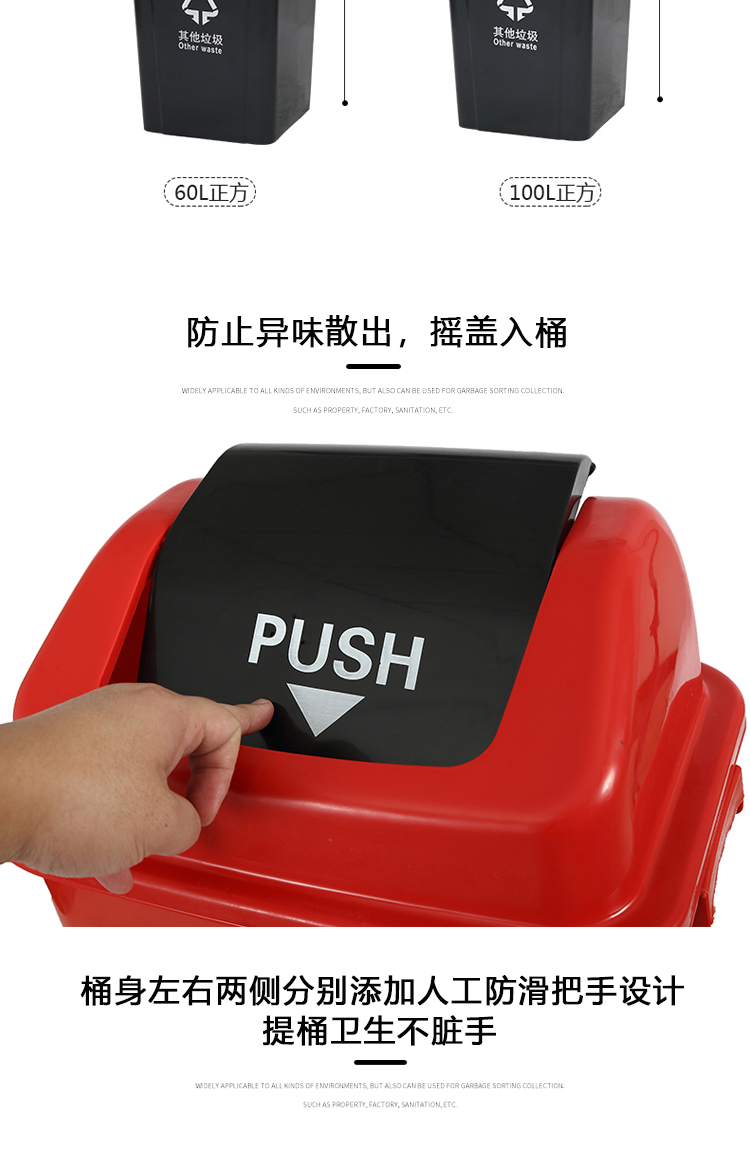 精選材料,源頭把控每一個(gè)品質(zhì)環(huán)節(jié),確保高品質(zhì)。產(chǎn)品名稱 660升塑料垃圾桶 產(chǎn)品型號 ZX-660L 產(chǎn)品顏色 綠色/灰色/藍(lán)色/黃色/紅色 外桶材質(zhì) 聚乙 內(nèi)桶材質(zhì) 聚乙烯 容量 660L 建議使用場景 街...