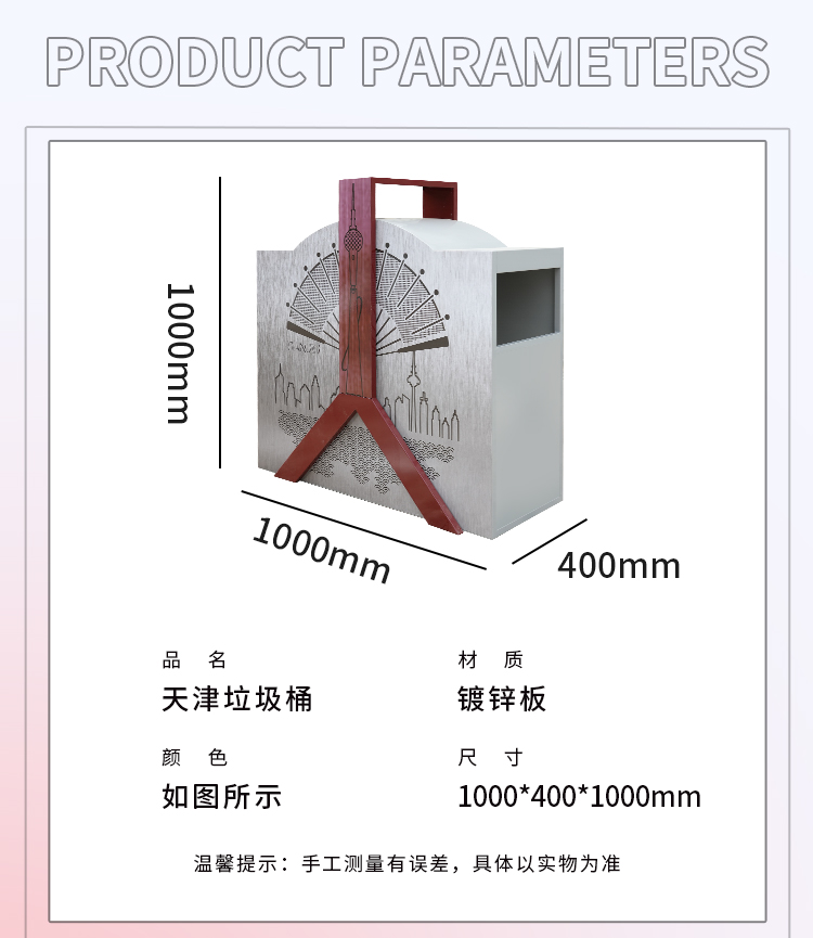 【品名】三分類(lèi)垃圾桶 【品牌】 中星 【材質(zhì)】?jī)?yōu)質(zhì)鍍鋅板 【內(nèi)膽】鍍鋅板、不銹鋼 【制作工藝】選用優(yōu)質(zhì)不銹鋼鋼板裁剪、壓制、折彎后再焊接而成型 【噴涂工藝】垃圾桶經(jīng)磷化噴砂處理后采用戶(hù)...